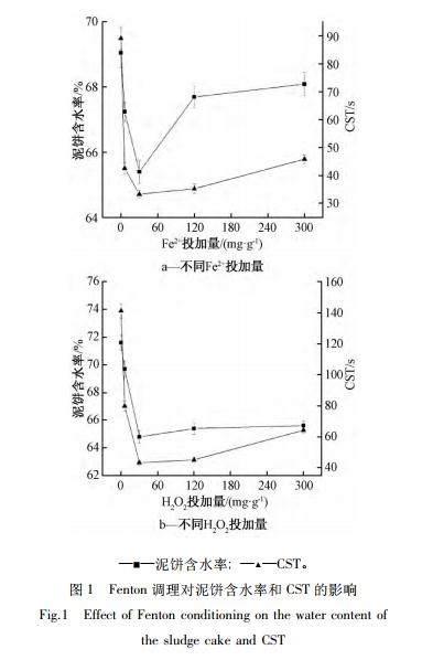 一般 認(rèn) 為 Fenton 試劑氧化的最佳 pH 為 2 ~4,本實驗中調(diào)節(jié)污泥 pH 為 3。30%H2O2 投加量為 30. 0 mg /g 時,F(xiàn)e2+投加量對污泥脫水性能的影響如圖 1a 所示。隨著 Fe2+投加量的增加,泥餅含水率和 CST 均先減小后增加,F(xiàn)e2+ 投加量為 30. 0 mg /g時,泥餅含水率和 CST 達(dá)到最小值,分別為 65. 4%和33. 3 s。Fe2+離子在 Fenton 反應(yīng)中作為催化劑促進·OH的產(chǎn)生,·OH 具有強氧化性,能夠破解污泥絮體、胞外聚合物( EPS) 和細(xì)胞的結(jié)構(gòu),氧化分解 EPS等有機物,促進細(xì)胞內(nèi)部水和結(jié)合水的釋放,改善污泥脫水性能。同時,F(xiàn)e2+被氧化生成的 Fe3+可以通過生成磷酸鐵沉淀及 Fe3+水解聚合沉淀產(chǎn)物進一步強化污泥脫水性能。