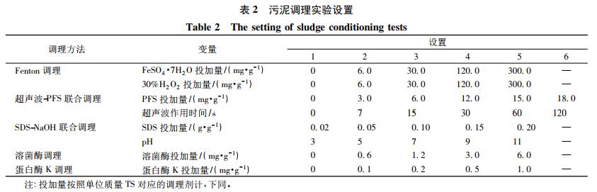 分別量取 50 mL 污泥樣品,對其先后進行不同方式的調(diào)理( 表 2) 。其中,F(xiàn)enton 調(diào)理和 SDS-NaOH 聯(lián)合調(diào)理實驗將污泥樣品置于磁力攪拌機上攪拌 1 h,超聲波-PFS 聯(lián)合調(diào)理實驗時超聲波頻率為 40 kHz,溶菌酶調(diào)理和蛋白酶 K 調(diào)理實驗將污泥樣品恒溫水浴并攪拌 1 h,取出后進行污泥泥餅含水率和 CST 的測定。