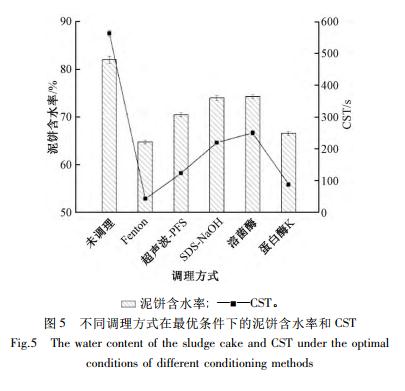 圖 5 對比了各調(diào)理方法在最優(yōu)條件下所得污泥的泥餅含水率和 CST。可知: 各調(diào)理方法能不同程度地降低污泥的泥餅含水率和 CST,提高污泥的脫水性能。Fenton 調(diào)理的效果最為突出,泥餅含水率下降17. 26 百分點,CST 下降 520. 6 s,其次依次是蛋白酶K 調(diào)理、超聲波-PFS 聯(lián)合調(diào)理、SDS-NaOH 聯(lián)合調(diào)理和溶菌酶調(diào)理。其中,SDS-NaOH 聯(lián)合調(diào)理的最優(yōu)pH 均為 3,NaOH 的協(xié)同作用反而使污泥脫水性能惡化。溶菌酶調(diào)理和蛋白酶 K 調(diào)理效果對比表明蛋白酶 K 更能促進污泥中水分的脫除,可能是由于蛋白酶 K 不僅能促進污泥中微生物細(xì)胞結(jié)構(gòu)的水解,還能水解污泥中原有的和細(xì)胞破解后釋放的有機物質(zhì)。